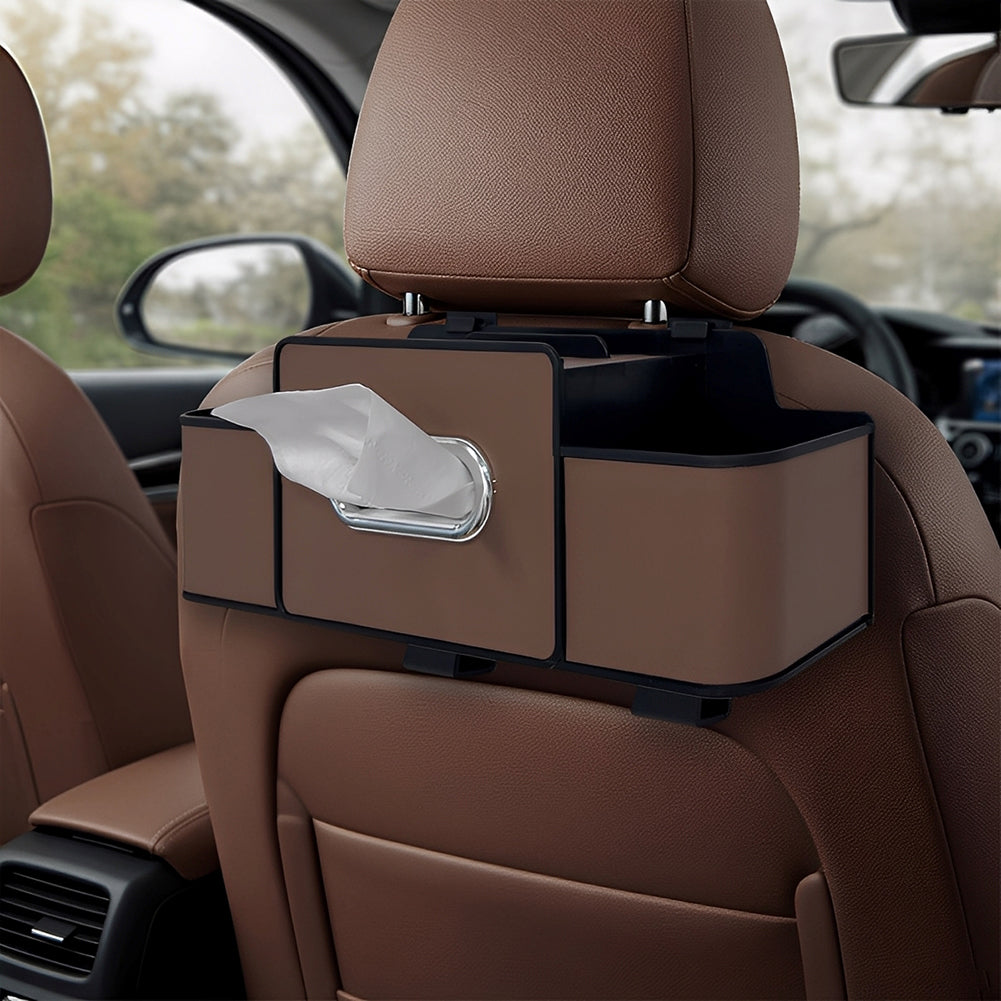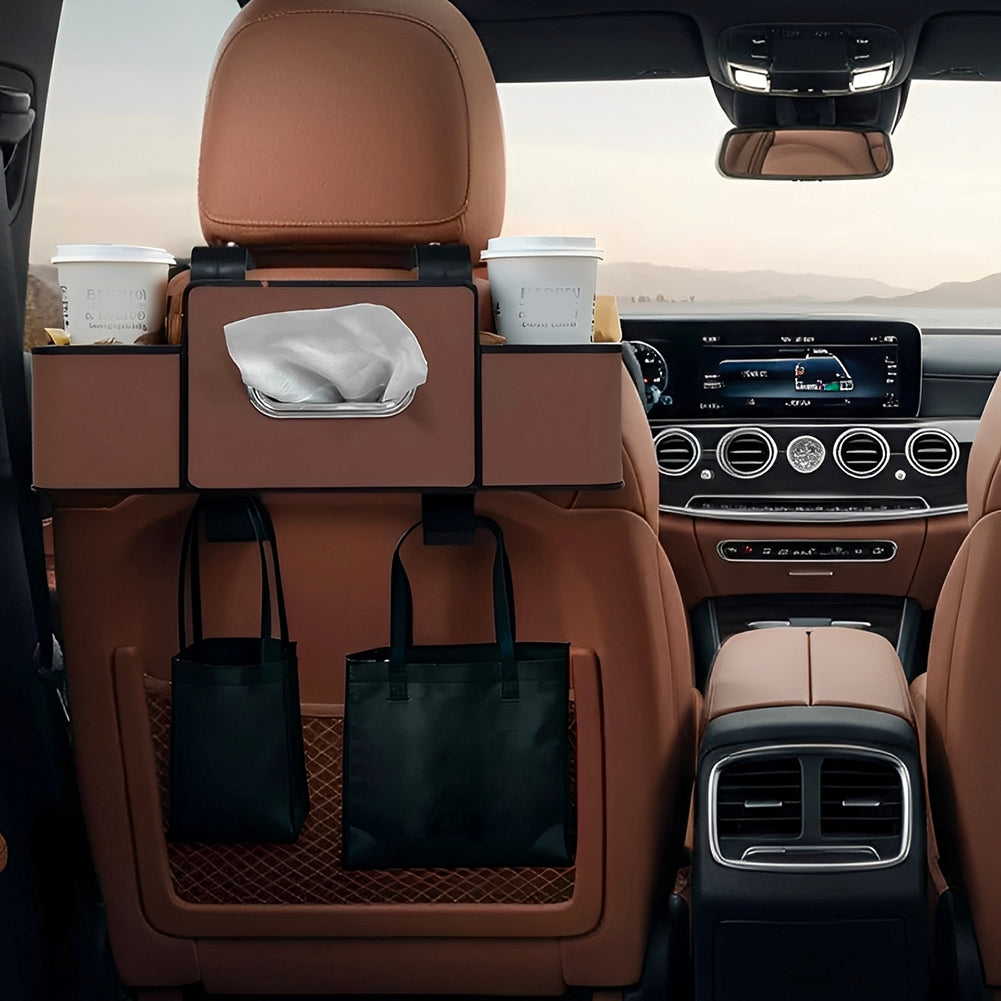 Car Back Seat Organizer with 2 Cup Holders – Leather Rear Seat Storage Box, Tissue Holder & Headrest Hanging Organizer for Family Travel