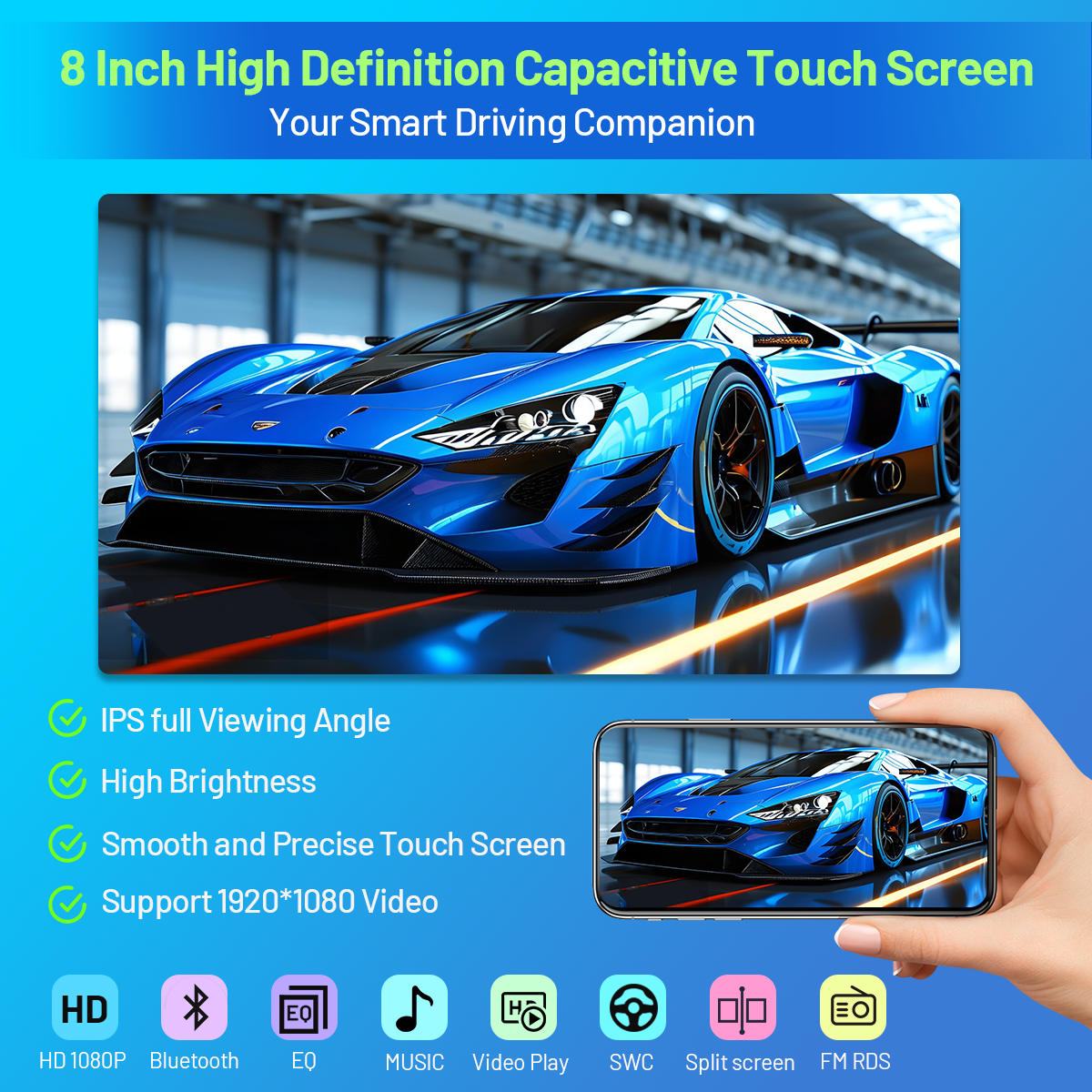 ✅🚗【Android Car Radio Multimedia Player】Car play radio has the latest Android 13.0 operating system 2GB (RAM)+32GB (ROM), powerful 4 core processor, HD 8 inch capacitive touch screen with 1024*600 resolution, bigger and clearer screen, giving you a wonderful visual experience.