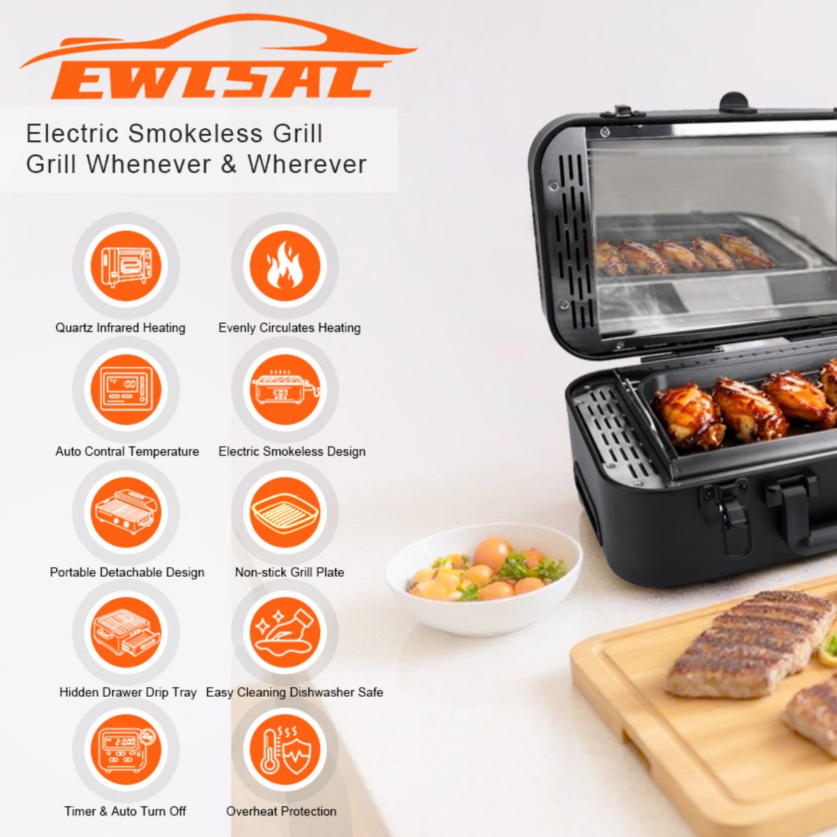 [Quick & Precise Cooking]: Grill steaks, chicken wings, burgers, and sausages fast with uniform heating; includes overheat protection for safe use.