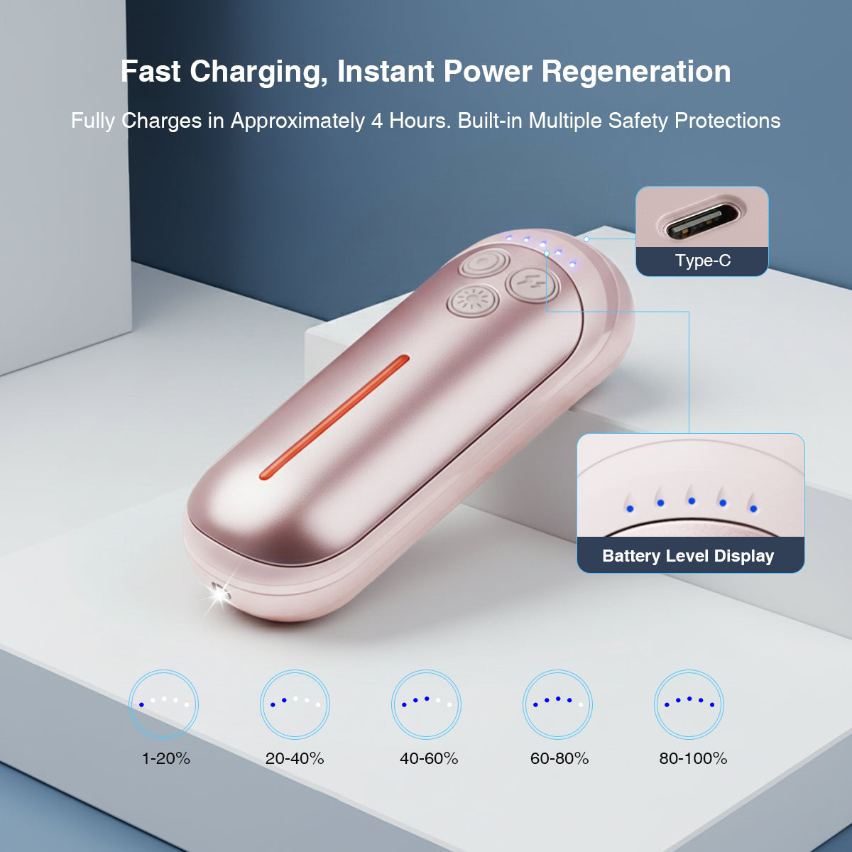 【Long Battery Life & Smart Power Display】Powered by high-capacity rechargeable batteries, each hand warmer offers hours of continuous warmth after a quick 4-hour charge. The 5-level LED power indicator clearly shows remaining battery so you’re never left in the cold.