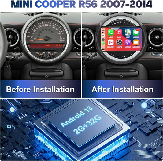 CarpartsX Android 13 Car Stereo for BMW Mini Cooper R56 (2007-2014) - 9" IPS Touchscreen, CarPlay, Android Auto, GPS, 2+32GB, AHD Camera&Mic, Bluetooth, SWC