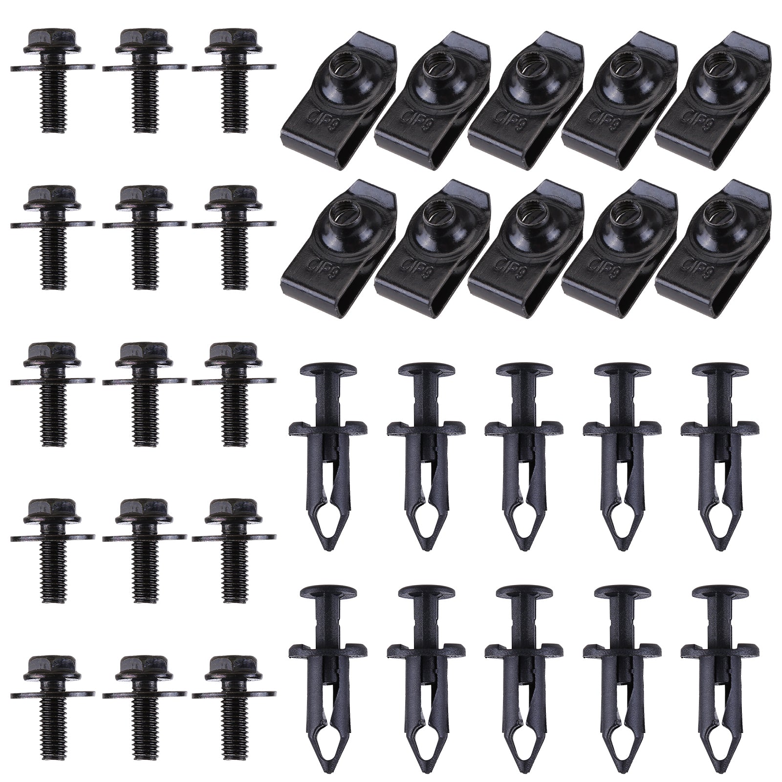 This 35-piece kit includes high-quality engine splash shield retainers, body bolts, and plastic push clips, perfect for replacing or securing underbody components on various Nissan and Infiniti models. Made from durable, corrosion-resistant materials, this kit is designed to provide a secure fit for engine covers, bumpers, fenders, and more. It’s a practical solution for maintaining your vehicle’s trim and underbody features, ensuring that your parts remain firmly in place.